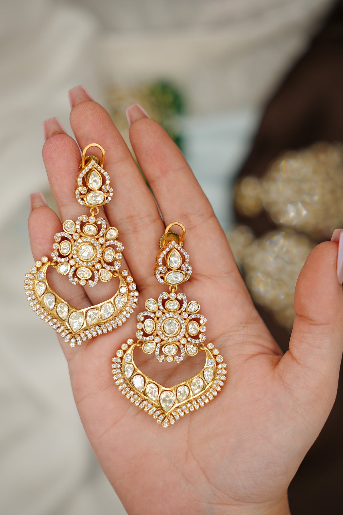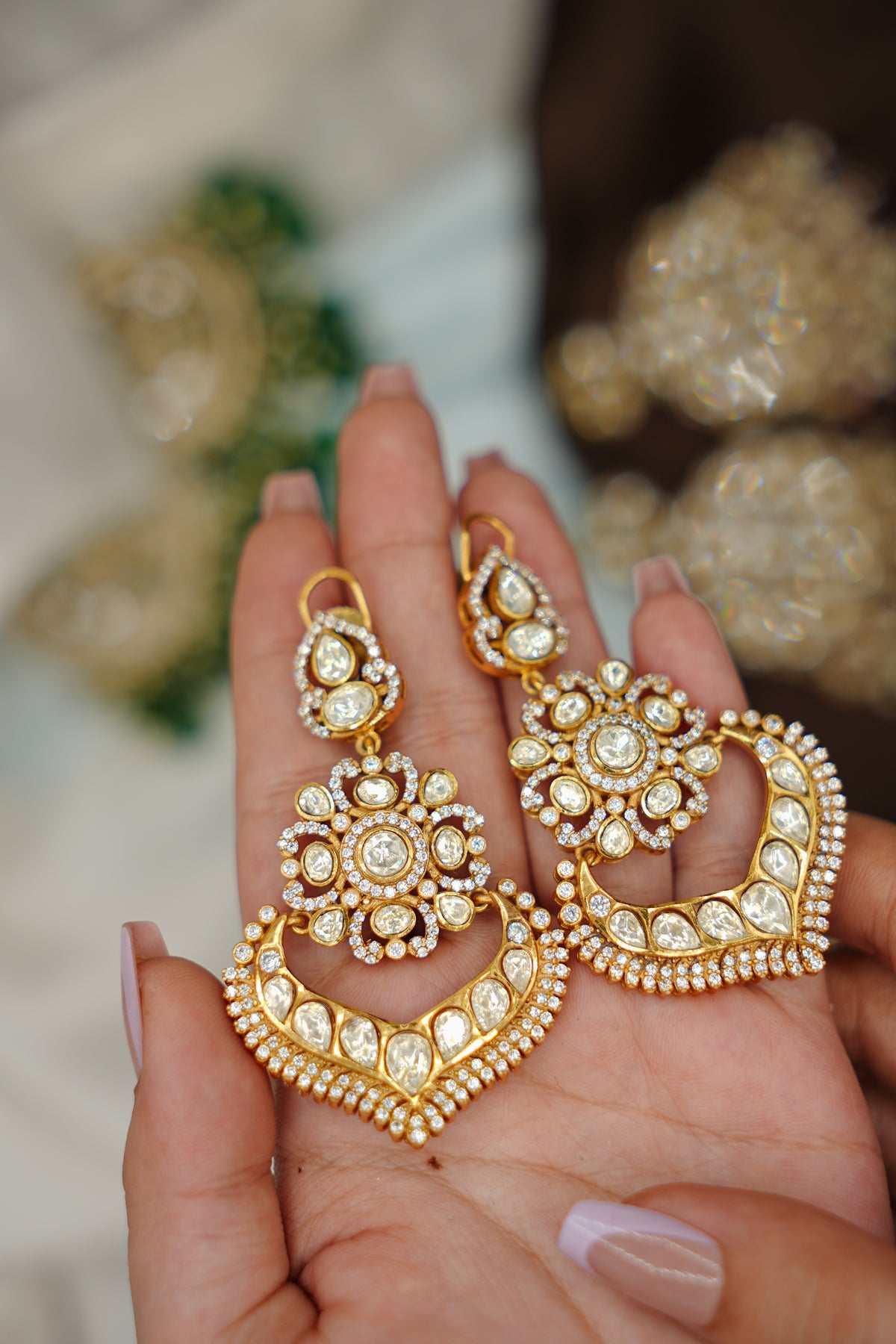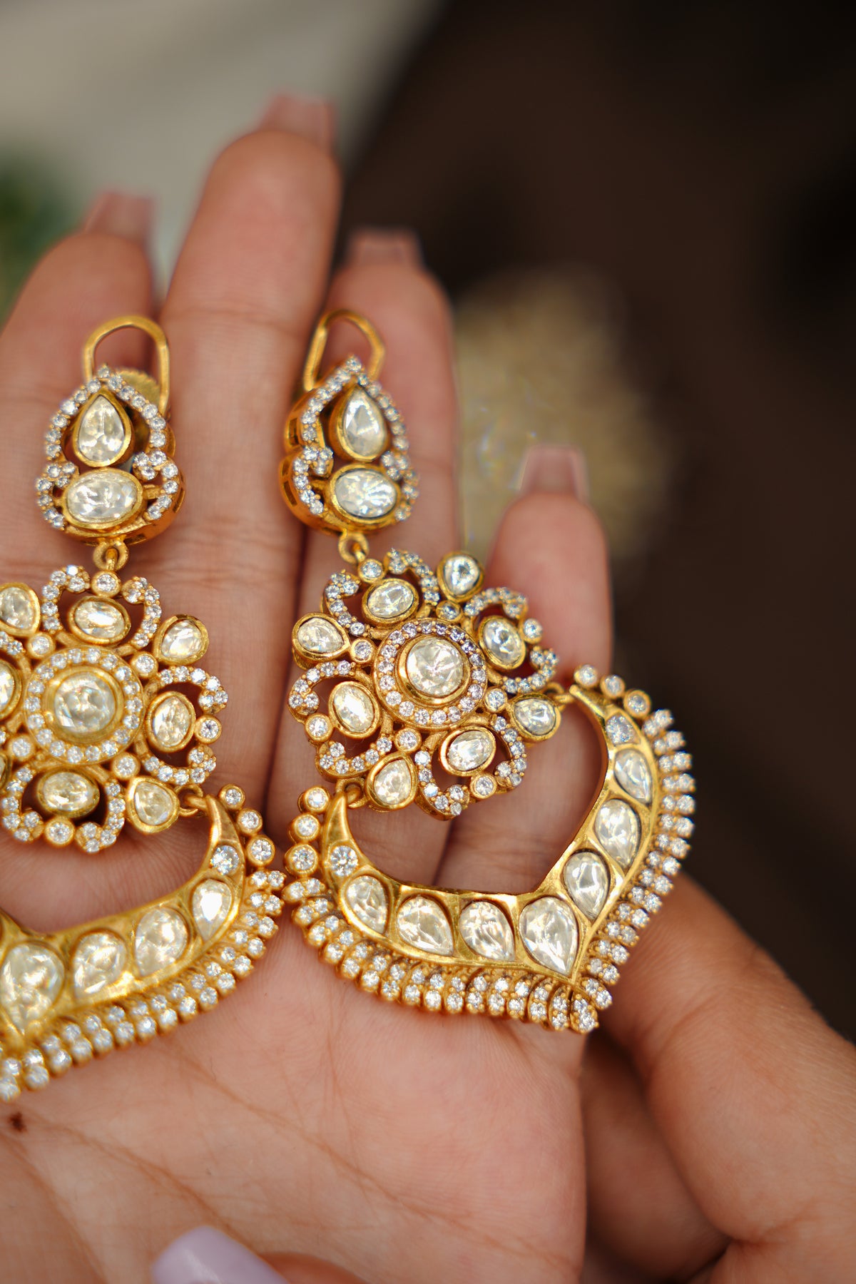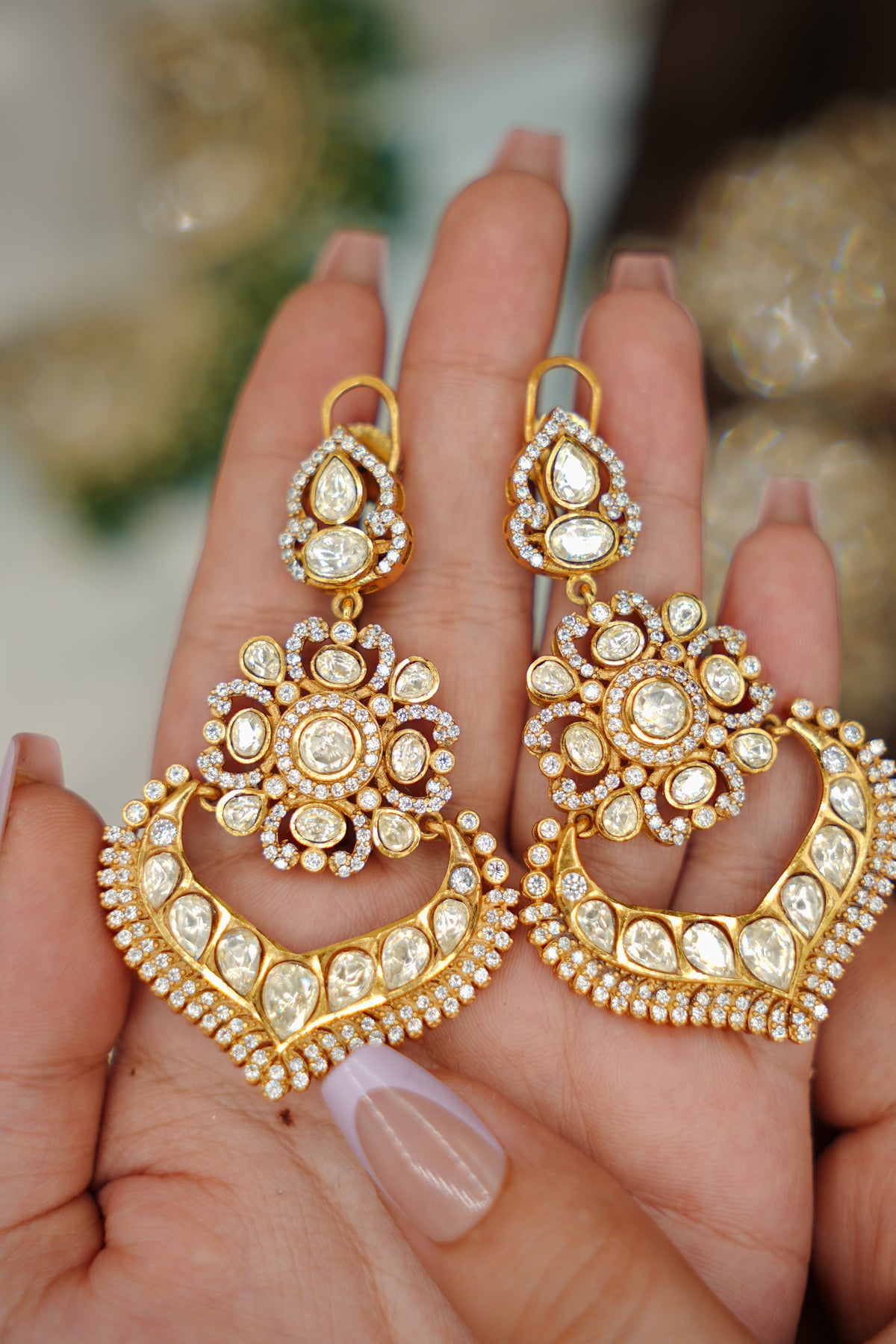 Elevate your elegance with Golden Grace, a stunning piece crafted from premium 92.5 silver and adorned with lustrous gold plating. This exquisite design features brilliant moissanite polki stones that capture light with exceptional sparkle and radiance. The perfect blend of traditional craftsmanship and modern sophistication, this piece brings timeless beauty to any occasion. Moissanite's durability ensures your jewellery remains radiant for years to come, while the gold-plated finish adds warmth and luxury to the pure silver base. A versatile treasure that complements both everyday wear and special celebrations.