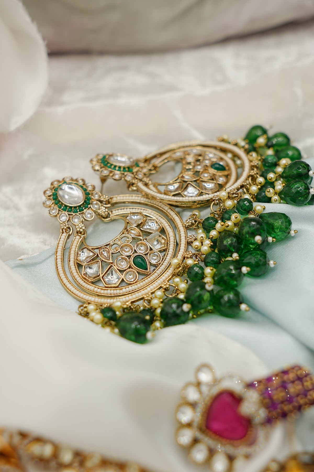 Rang-e-Zamrud showcases the timeless elegance of 92.5 sterling silver, expertly crafted and finished with luxurious gold plating. This exquisite piece features stunning emerald pawai work, adding a vibrant splash of color and traditional artistry. The combination of precious metals and gemstone detailing creates a sophisticated accessory perfect for special occasions or everyday elegance. Each piece reflects meticulous craftsmanship and authentic design, making it a treasured addition to any jewelry collection.